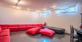 Підвальний поверх: елегантна таверна з зоною відпочинку, окрема кухня, комора, винний погріб, ванна кімната та просторий гараж площею 107 м².
