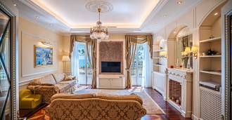 - розкішного майстер-сьюта з власною напівкруглою гардеробною та чудовою ванною кімнатою з натурального мармуру з окремою ванною, душовою кабіною та туалетом, а також виходом на терасу з видом на море,