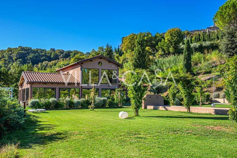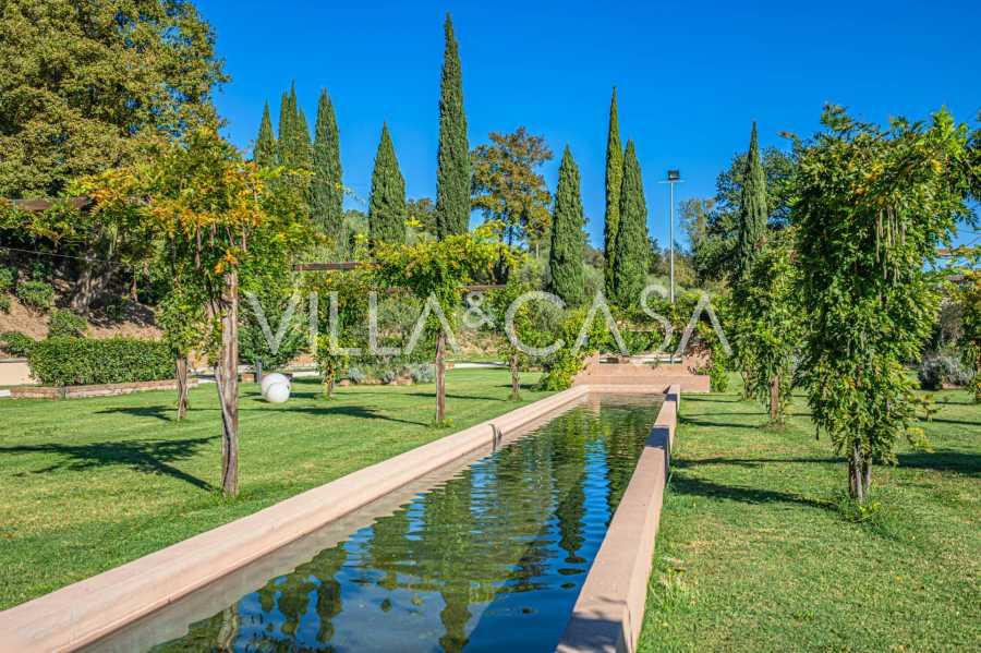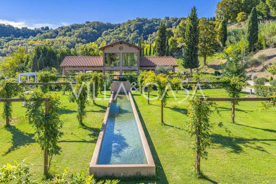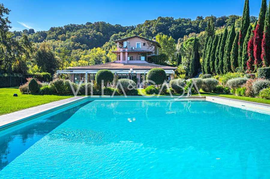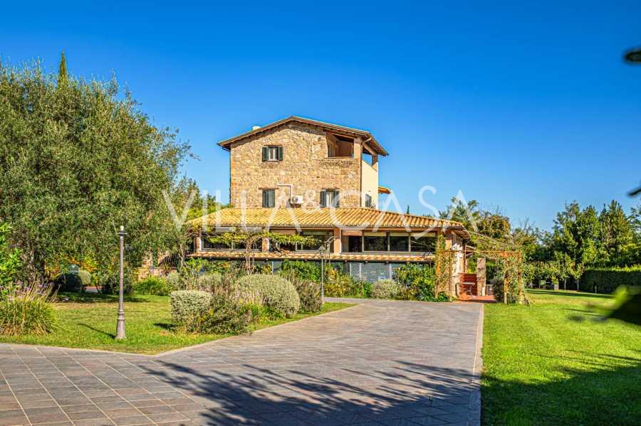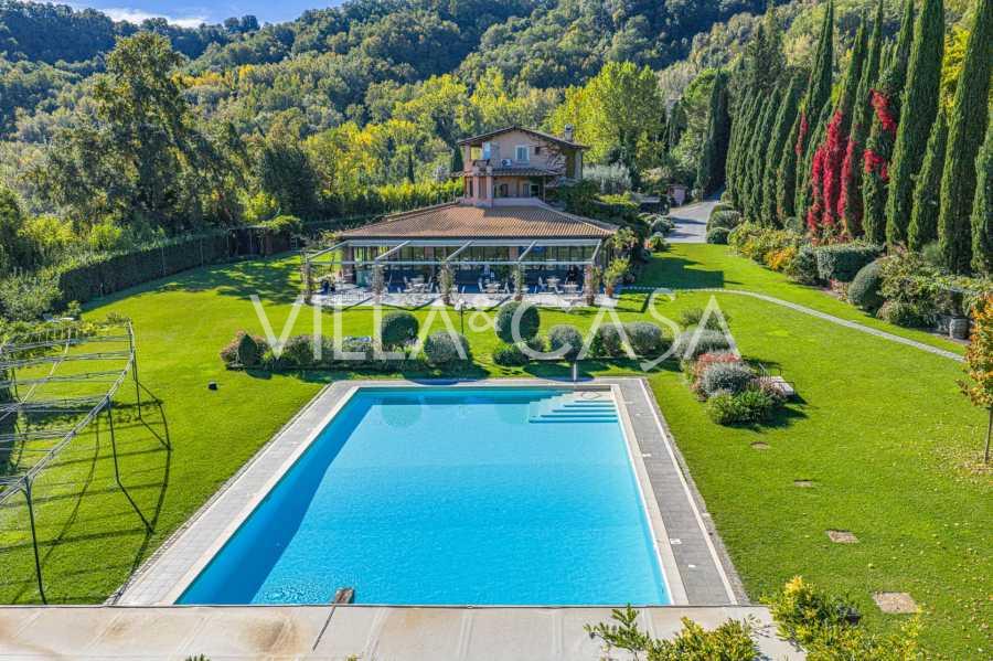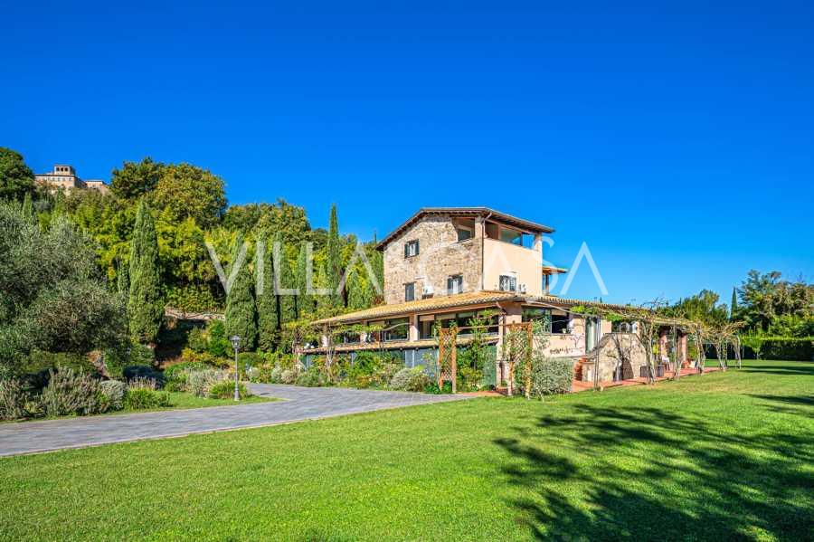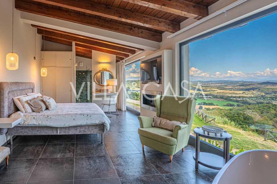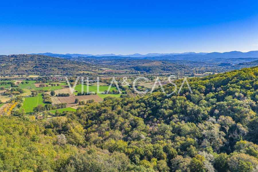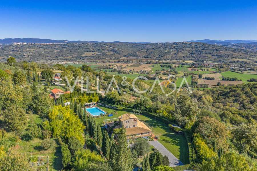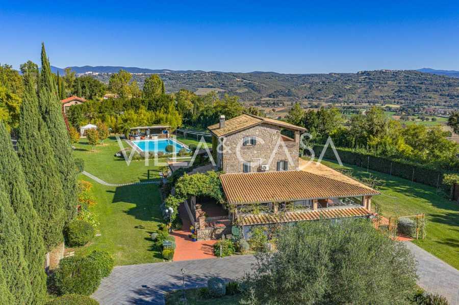 У провінції Вітербо, на височині пагорбів, відкривається приголомшливий вид на долину Тибру. Маєток займає близько 25 гектарів доглянутого парку, створюючи атмосферу повного спокою та усамітнення. Кожен куточок спроектований для комфорту, елегантності та гармонії: сонячні тераси, альтанки, витончені шезлонги біля басейну та тінисті алеї, оточені віковими деревами.